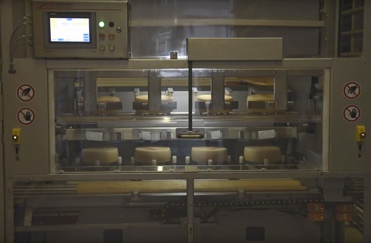 Unser Pflegeroboter schmiert und wendet unsere Käselaibe zwei bis drei Mal in der Woche, bis sie den gewünschten Reifegrad erreicht haben. Dies ist wichtig für die Reifung der Käse und auch für dessen Geschmack.